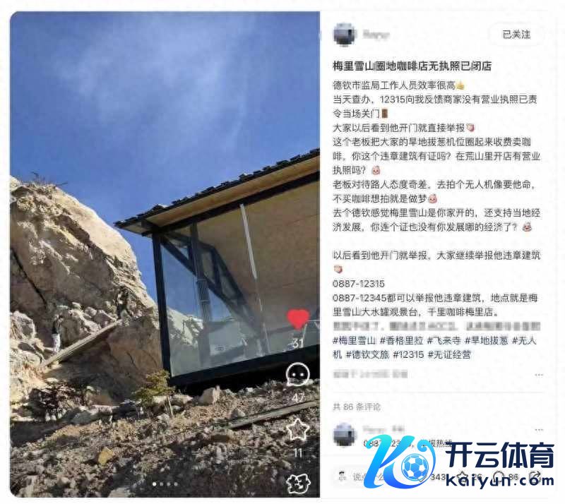 近日,多名户外喜欢者发帖称,不雅看梅里雪山的一处网红拍照机位“旱地拔葱”被当地一咖啡馆围了起来,搭客必须进店破钞才智到网红机位打卡。联系帖子激励热议。上游新闻(报料邮箱:baoliaosy@163.com)记者轻松到,有网友暗示,该咖啡馆并无联系交易证照云开体育,经举报后已被查封。12月17日,上游新闻记者从云南省德钦县商场监督责罚局证实,该咖啡店的交易派司真是未办理下来,仍是让其收歇。