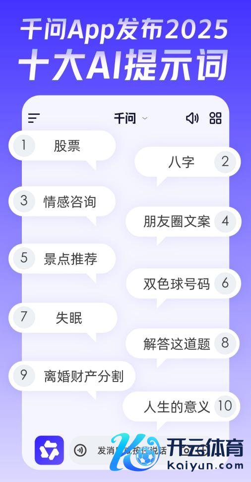 上证报中国证券网讯(记者杨翔菲温婷)12月22日,千问App发布“2025十大AI辅导词”榜单,揭示了2025年东谈主们使用AI的十大高频场景,“股票”高居首位开云体育,远超其他用具性、生涯类或形式类话题。这一恶果不仅折射出东谈主们对成本市集的高度关心,也标识着AI正深度融入个东谈主的投资决议。