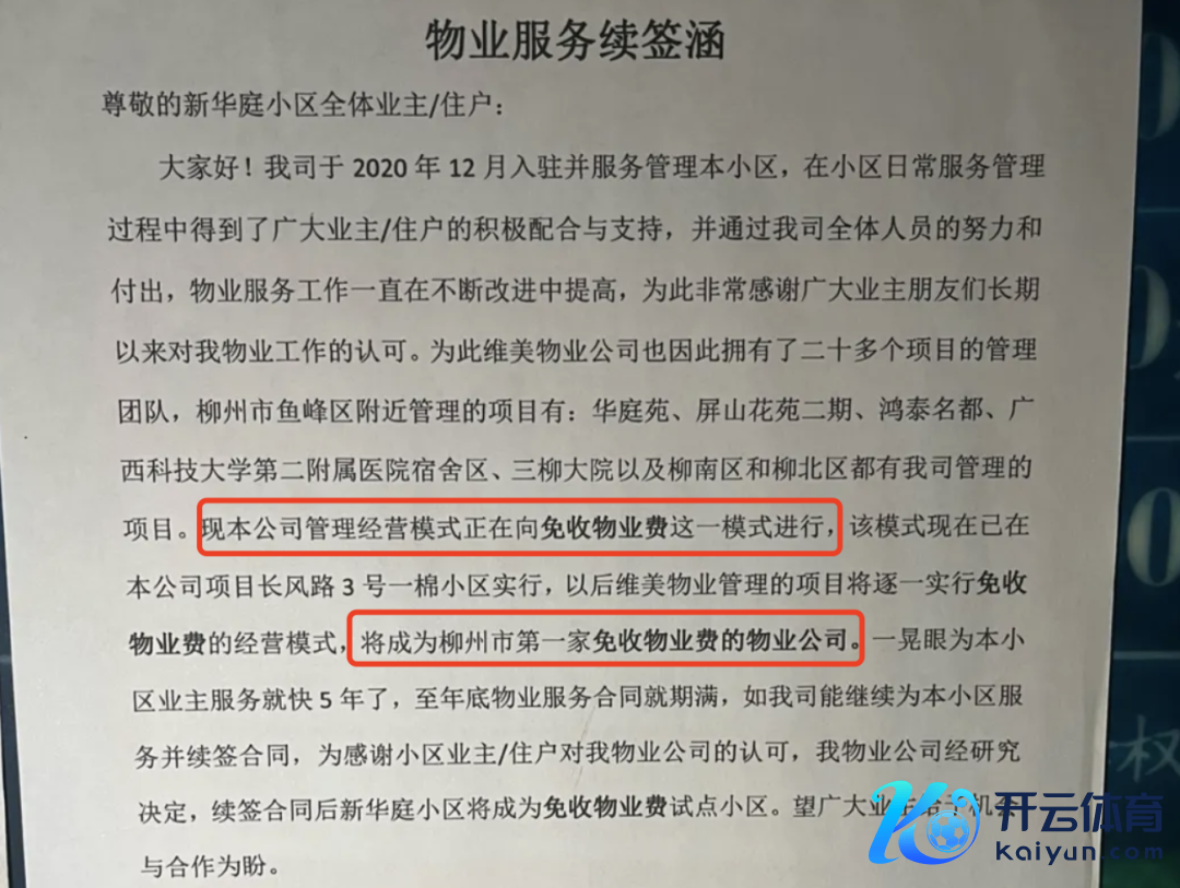 《物业服务续签函》的题名单元为柳州维好意思物业服务有限公司(以下简称维好意思物业),内容线路,公司于2020年12月入驻并服务解决新华庭小区,本年底物业服务协议期满。