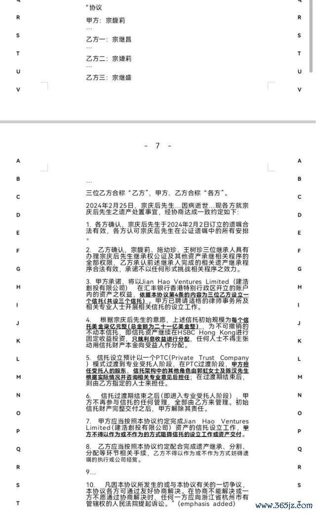 不外,香港高等法院的法官也尽头强调——"本案的诉讼并不波及宗庆后的遗产的处置事项,前述配景仅为后文说起的接头条约提供诱惑基础,该等条约中说起了上述遗嘱。"