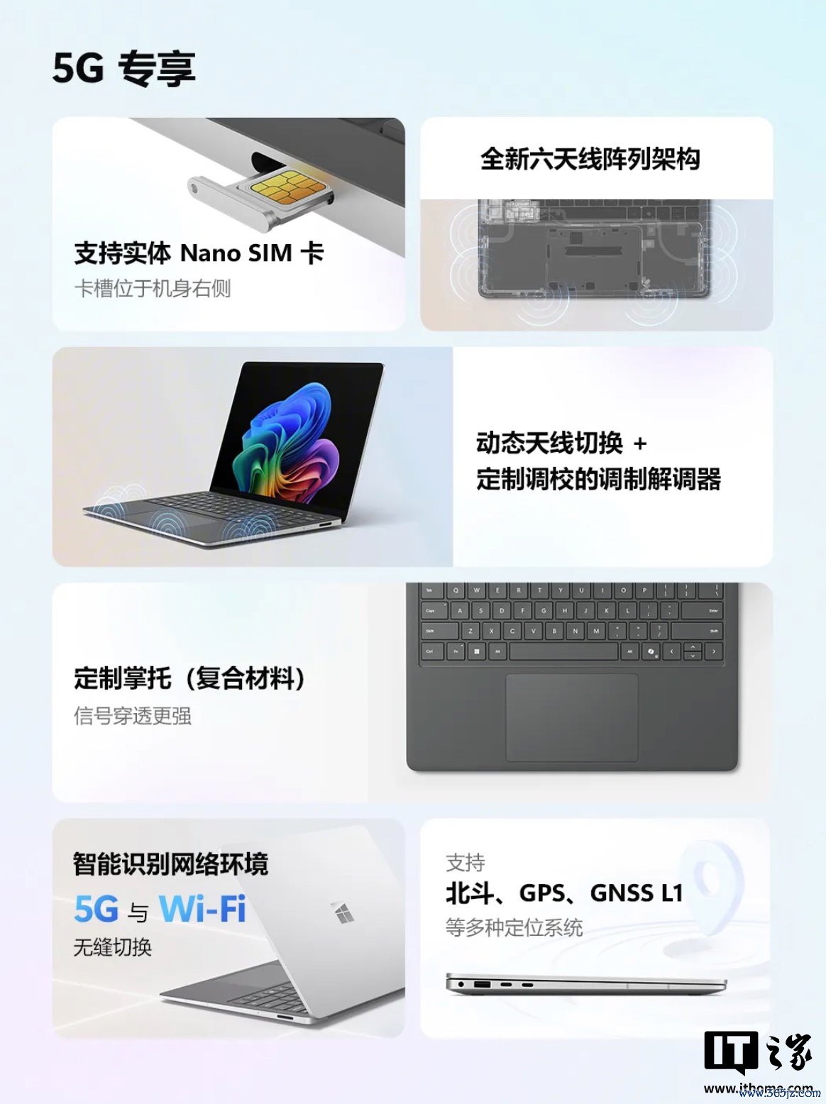 IT之家 10 月 14 日讯息,据微软科技公众号,微软全新 Surface Laptop 5G 商用版(13.8 英寸)现已珍惜发售,其相沿实体 Nano SlM 卡,相沿智能切换 5G 和 Wi-Fi。