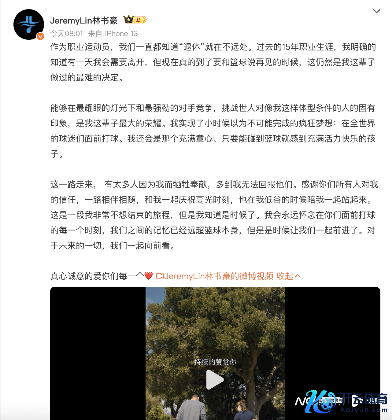 8月31日,林书豪得当在应付媒体晓示退役,并同步晒出伴随妻儿的视频画面,知道将来的要点将转向家庭。
